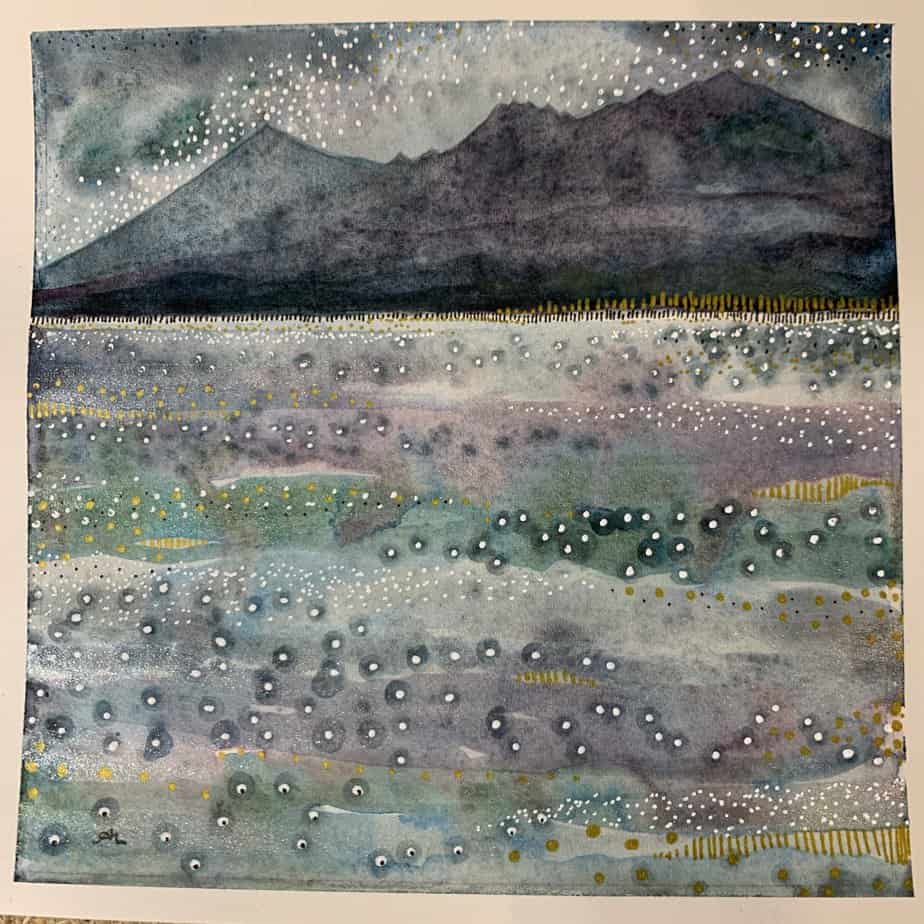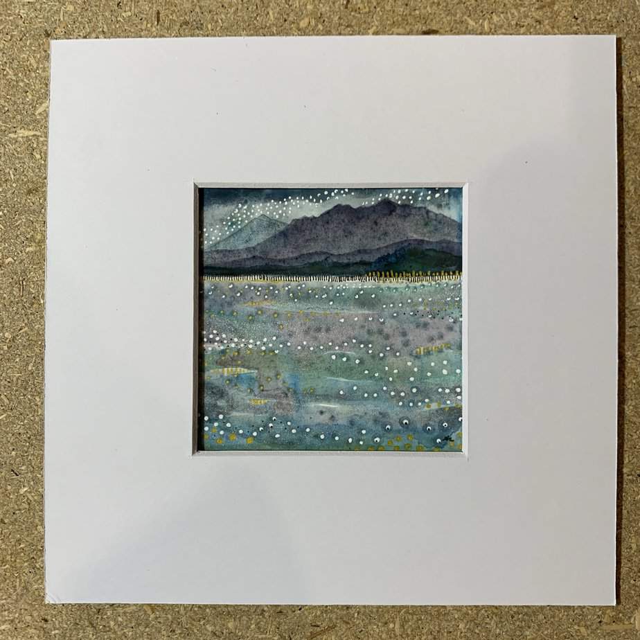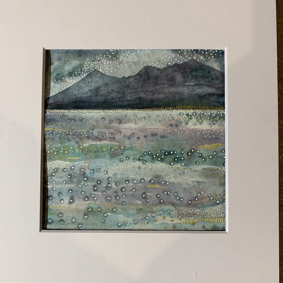I painted this 4” watercolour on Scalpsie Bay. I have set it in a 6” white mount. I finished the painting with ink line work. It is ready to frame and will make a lovely gift.