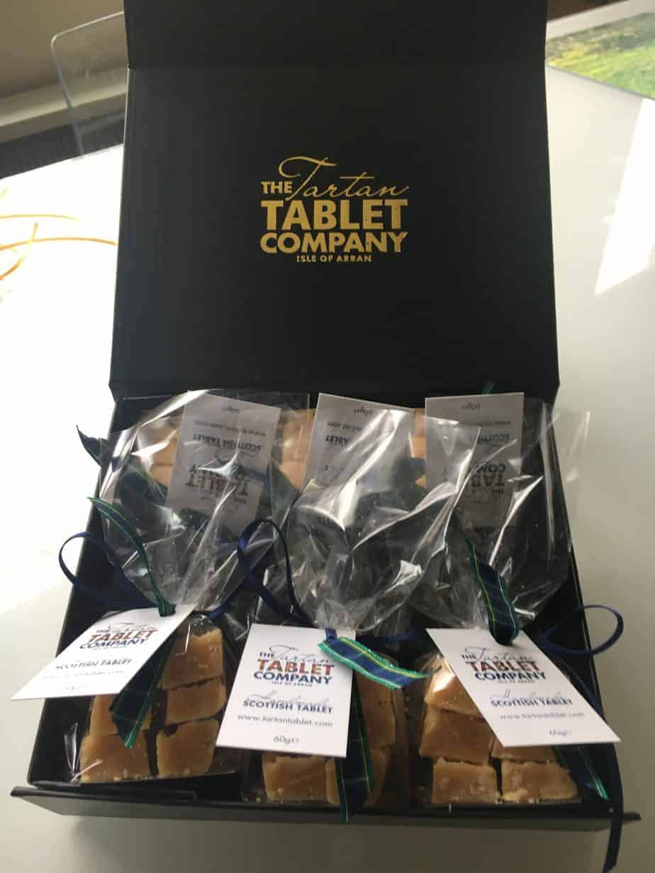 We are makers of Scottish Tablet using the finest Malt whiskies and Scottish Gins for flavouring. Our flavours from Arran include Arran Gold, a malt whisky cream liqueur (like Baileys). 10yr old Arran Malt and Arran Gin with an orange extract. Butter and Vanilla are our best selling plain flavours. Other Scottish flavours used are Edinburgh Gin liqueurs Rhubarb & Ginger and Raspberry. Rock Rose Gin from Thurso is very popular too. On the Isle20 site we are selling Gift boxes with 2 x 125g bags of your choice of tablet or 6 small 60g bags. 100 squares of tablet can also be purchased in any of the aforementioned flavours. The Allergens in our ingredients are Milk : Butter and Soya. These are clearly marked in Bold on the rear of each Tag or included on a tag with loose tablet.