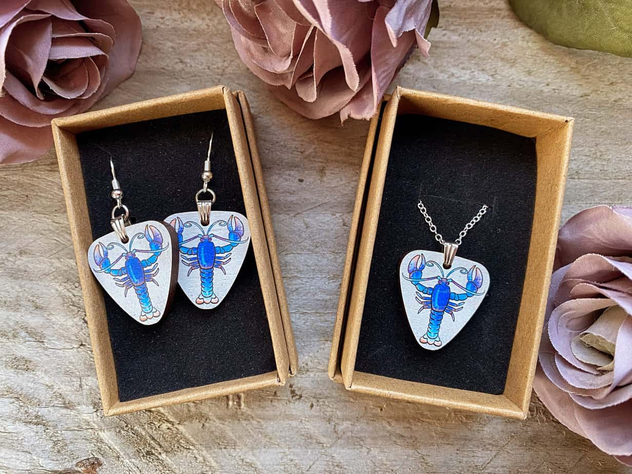 Blue lobster earrings and necklace made of sustainably sourced wood and 925 sterling silver plated hooks and chain. Illustration by Jazz Buchanan in Isle of Skye, printed onto wood and handmade into jewellery.