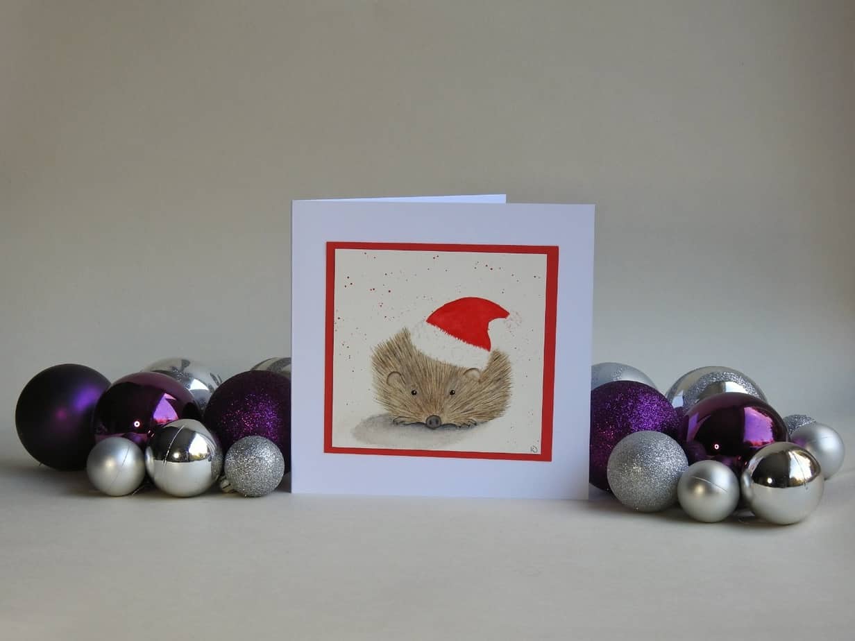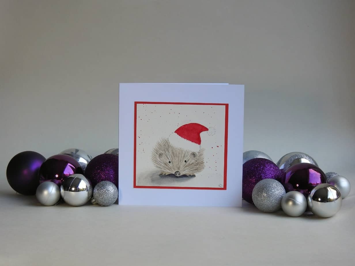 Beautifully hand painted watercolour Christmas card. These cards have an adorable Christmassy hedgehog, painted on 300gsm, 100% cotton watercolour paper. Each card is unique but similar and is mounted on coloured card, on a white 6″ x 6″ card and comes with a matching white envelope.