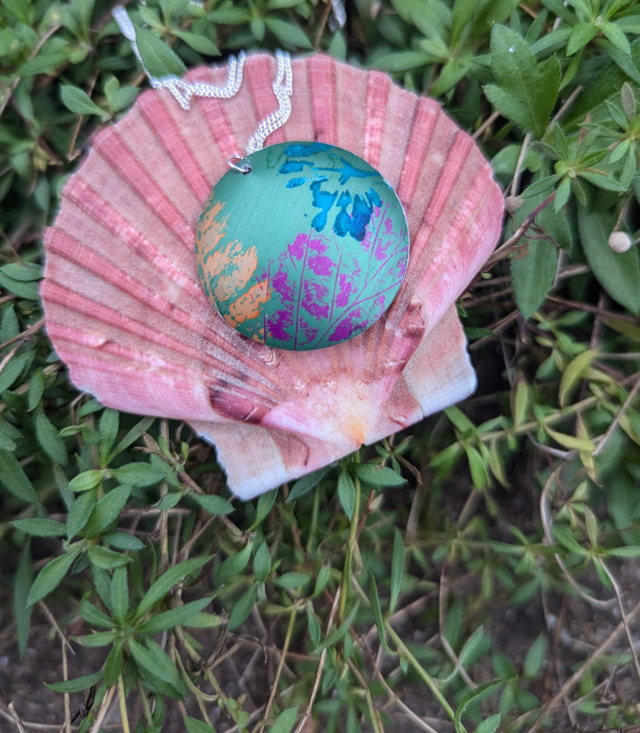 My pendants and earrings are made using aluminium. They are hand dyed and imprinted with local wildflowers in Glenbrittle. The chain and jump rings are sterling silver. They vary in size and each one is unique.