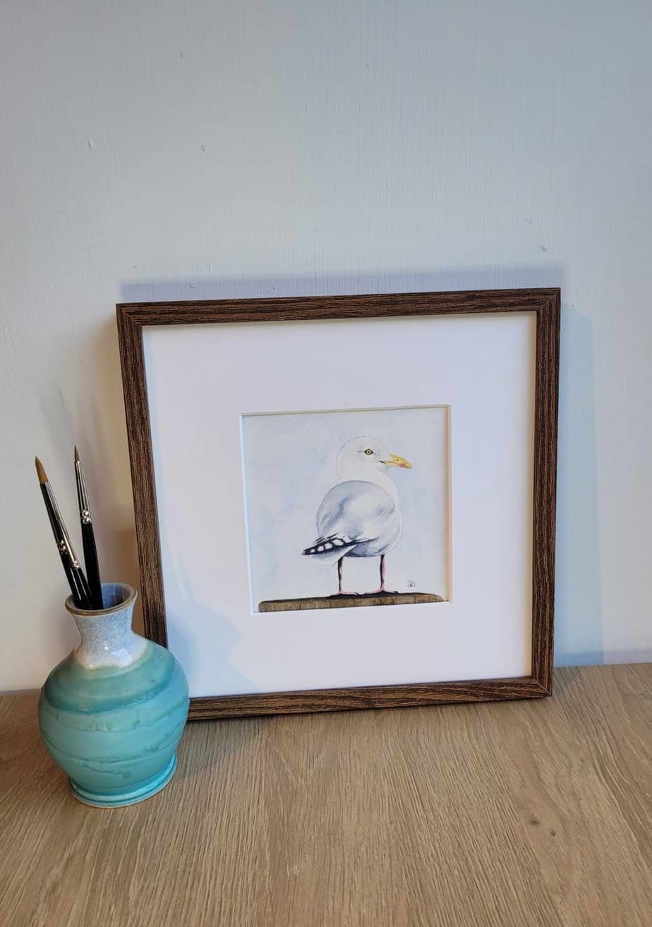 Original, signed and square framed watercolour painting of a Herring Gull.