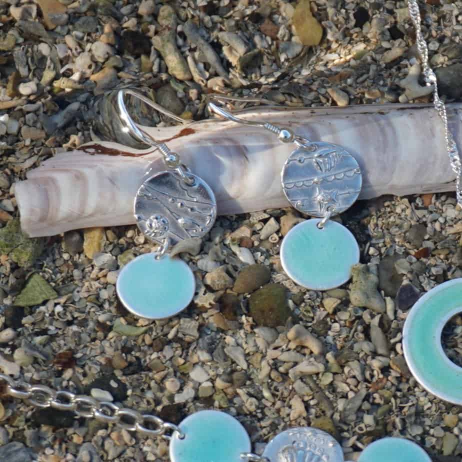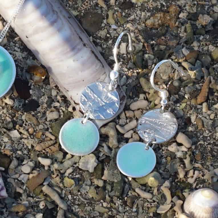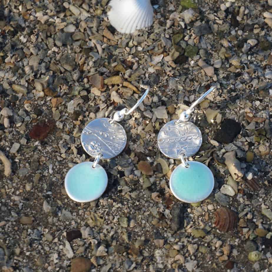 These earrings combine those turquoises and blues with the strandlines of seaweed and shells on the beach. Each earring has an enamelled turquoise blue disc hanging from a silver disc with patterns of the beach. The earring wire is sterling silver.