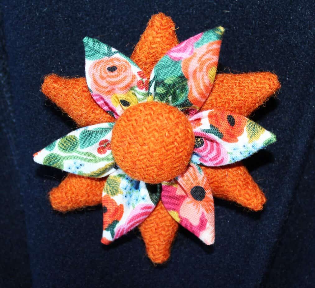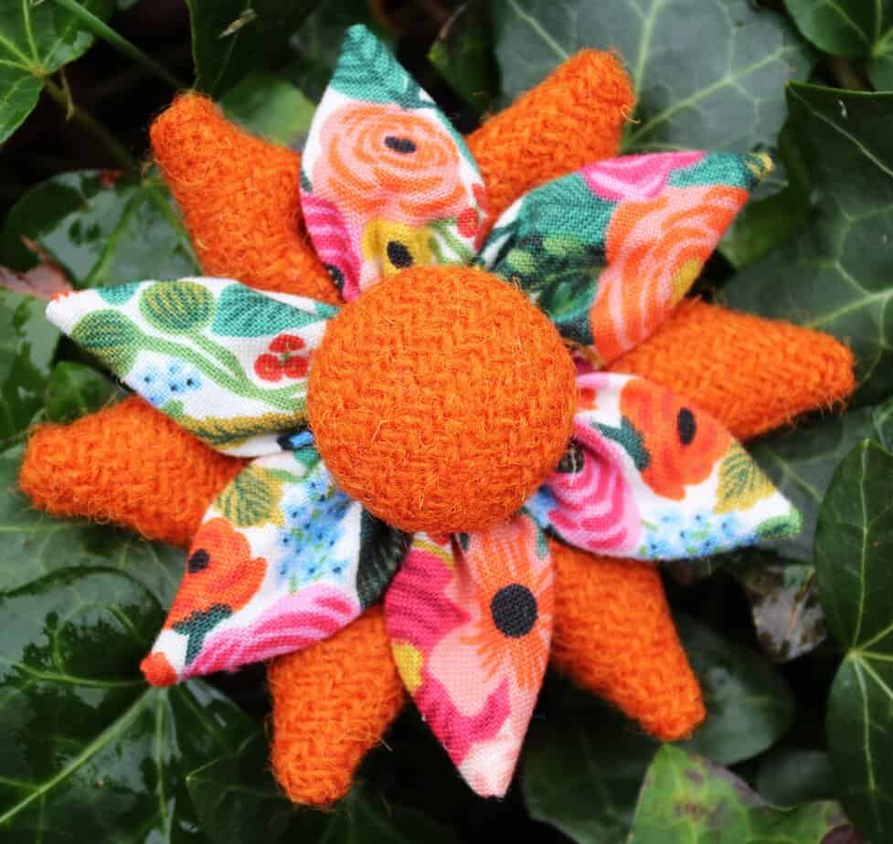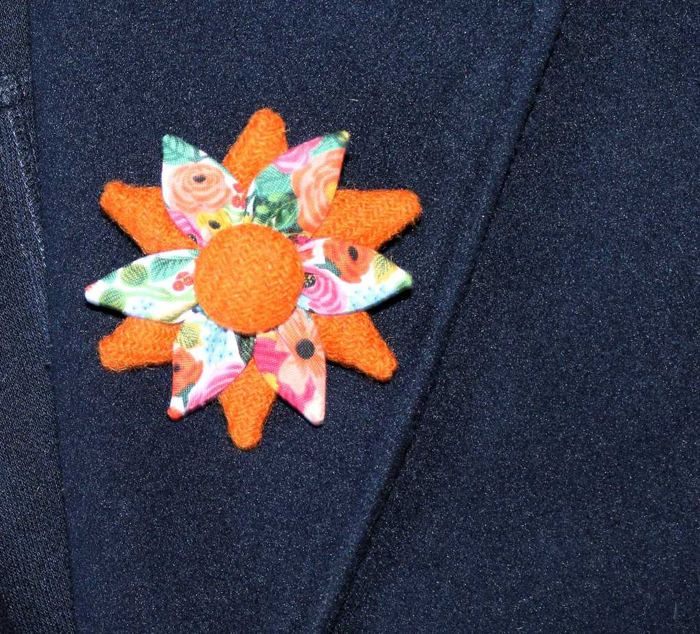 Orange Harris Tweed and floral fabric petal corsage brooch. It consists of 6 Harris Tweed petals, 6 floral petals and a Harris Tweed covered button. This is approximately 8cm in diameter but can be made in different sizes. It has a 3.5cm round brooch back pin fastening for a professional finish. It is hand finished to a very high standard as befitting the premium quality associated with these fabrics.