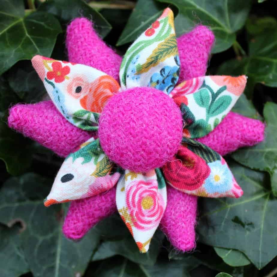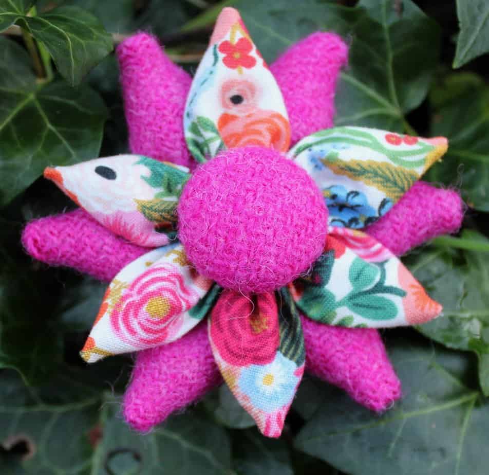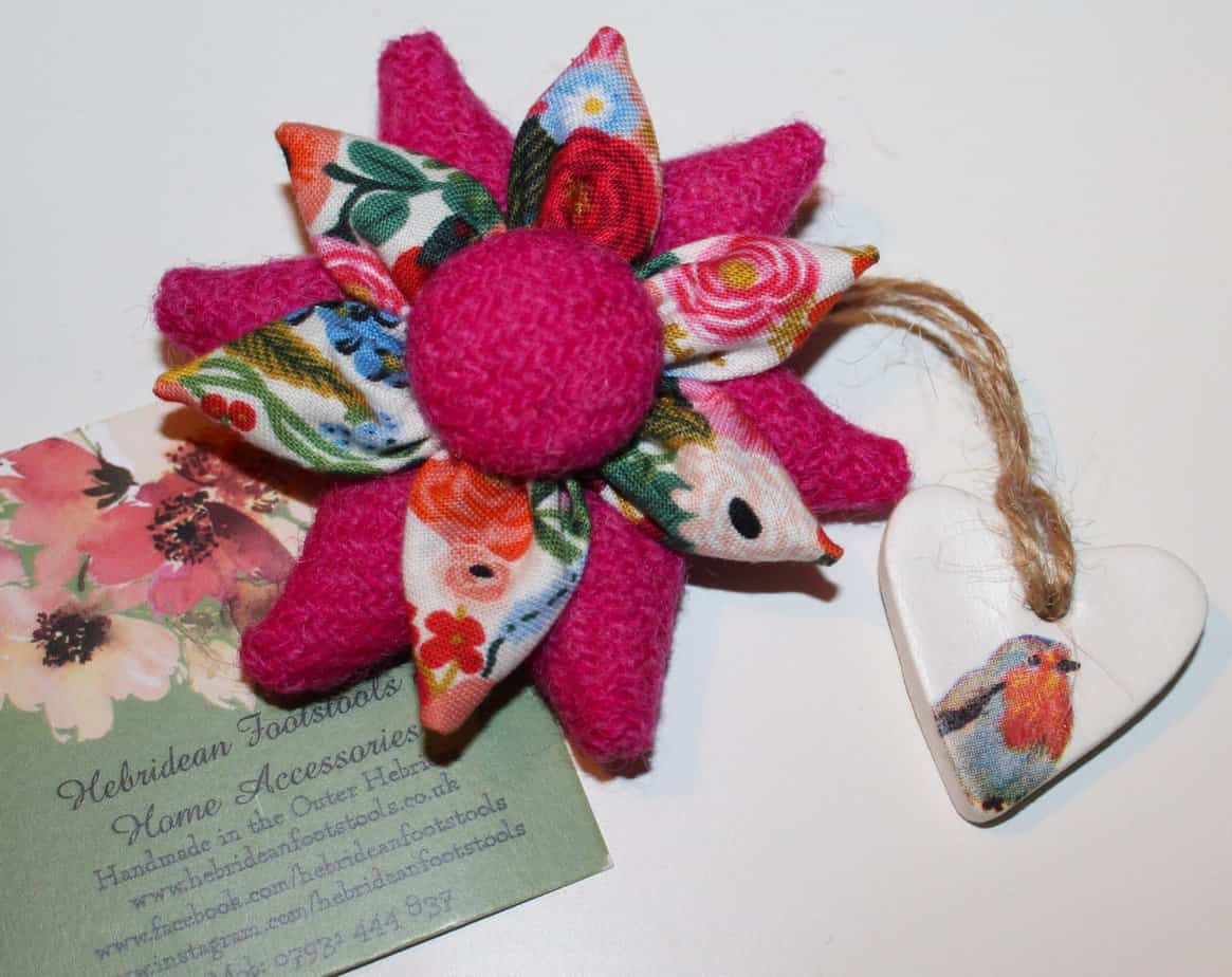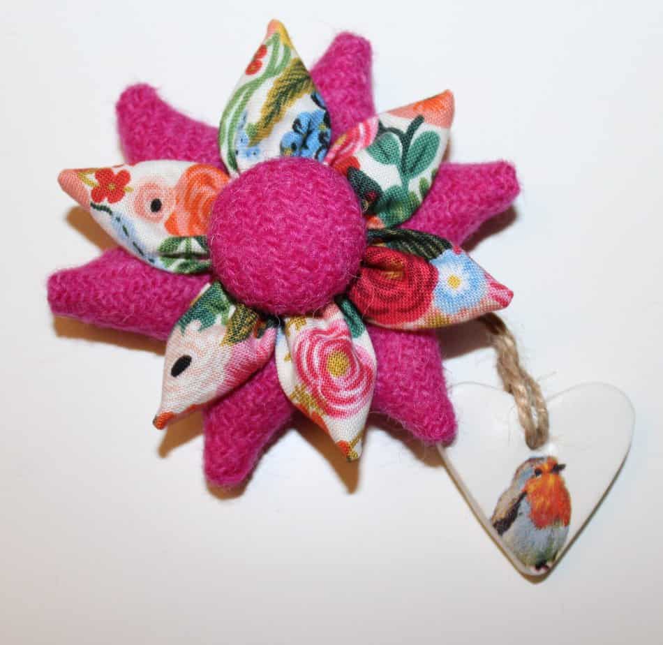 Pink Harris Tweed and floral fabric petal corsage brooch. It consists of 6 Harris Tweed petals, 6 floral petals and a Harris Tweed covered button. This is approximately 8cm in diameter but can be made in different sizes. It has a 3.5cm round brooch back pin fastening for a professional finish.   It is hand finished to a very high standard as befitting the premium quality associated with these fabrics.