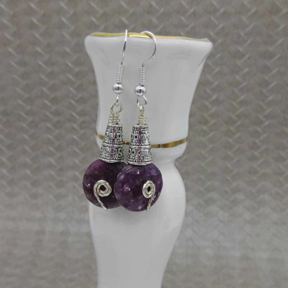 These are earrings that make a statement! With hammered wire detail, they showcase the gorgeous heather purples of the gemstone Lepidolite.