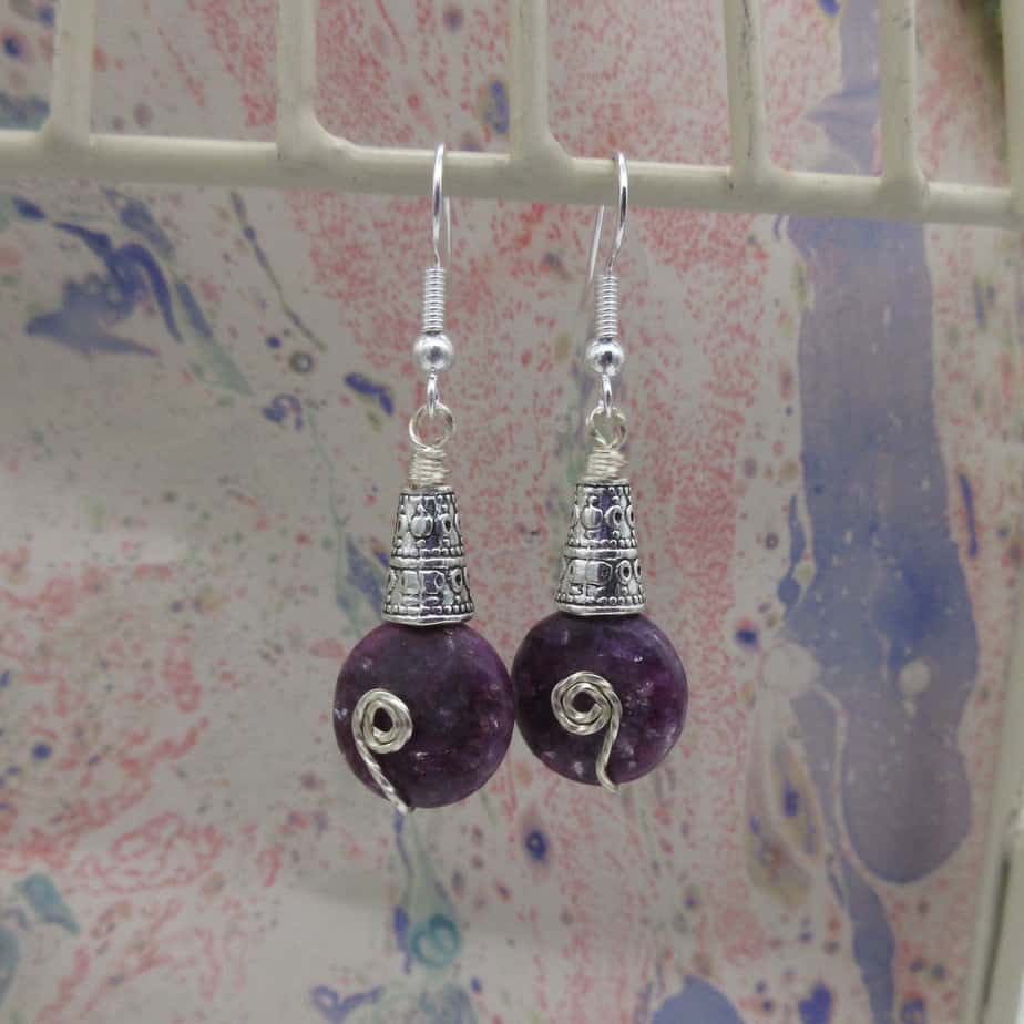 Finished with silver plated bead cone bead caps and silver plated wire, they hang from silver plated ear wires. Drop length 2.5cm.