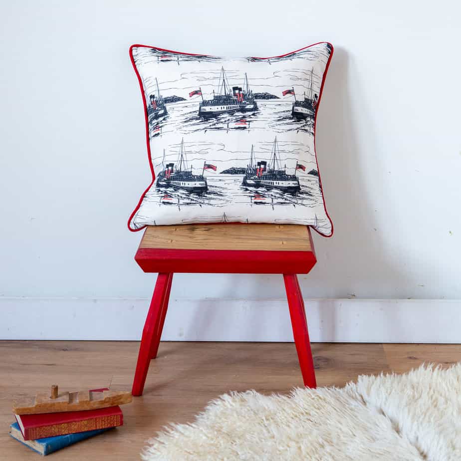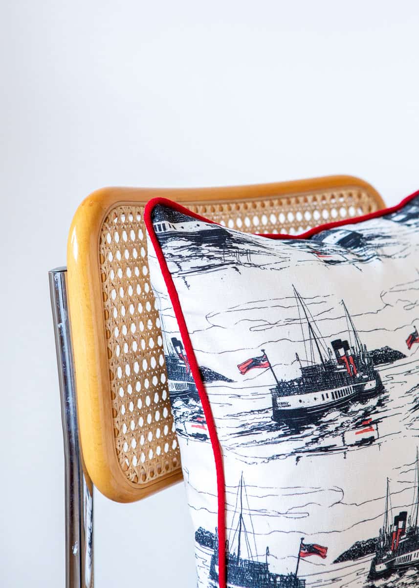 Ink drawing of Waverley printed on natural linen union and piped in red Bute wool. Comes complete with generous ethically sourced feather inner.